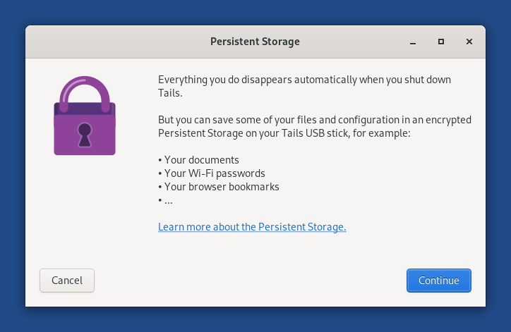 Pour créer le stockage persistant, choisissez Applications ▸ Tails ▸ Stockage persistant.